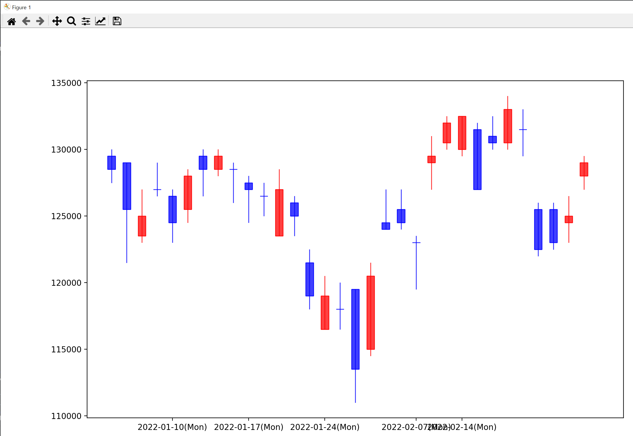 mpl_finance.candlestick2_ohlc(ax, skhynix['Open'], skhynix['High'], skhynix['Low'], skhynix['Close'], width=0.5, colorup='r', colordown='b')