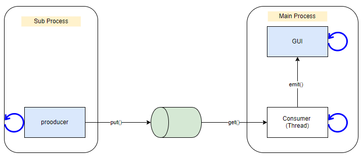 생산자의 반대 역할이 바로 소비자(Consumer)입니다. 소비자는 큐만 쳐다보고 있다가 큐에 데이터가 입력되면 데이터를 큐에서 빼옵니다. 그리고 큐에서 빼온 데이터를 PyQt와 같은 GUI 담당 스레드에게 전달해줍니다. 소비자 역시 언제 생산자가 데이터를 큐에 넣어줄 지 모르기 때문에 계속해서 큐를 쳐다보고 있어야 합니다. 그래서 GUI와 달리 별도의 스레드로 구성합니다.
