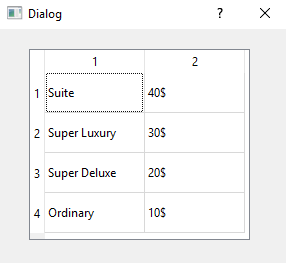 If you want to display information in four rows and two columns of Table Widget, create a list named data that stores four tuples, each of which consists of two elements, roomtypes and roomRent. In the addcontent method, you fetch one tuple at a time from the data list and assign it temporarily to the tup variable. The tup variable contains two elements, room type and room rent. With the help of another for loop, you fetch each element from the tup variable; that is, you fetch room type and room rent and assign them to the item variable. The content of the item variable is then converted into an instance of QTableWidgetItem and assigned to oneitem, which in turn is further assigned to and displayed in Table Widget at a particular row and column position using the setItem method. With the help of nested for loops, you display the information of the data list in Table Widget, as shown in the following screenshot: