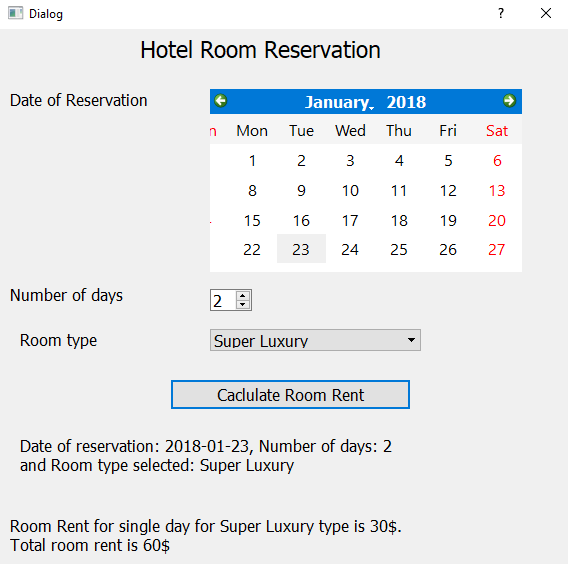 The next application is a hotel reservation form that prompts the user to specify the date of the reservation, the number of days staying, and the room type the user wants to book. Then, it computes the total room rent accordingly. The user can specify the date of his journey with Calendar Widget, the number of days with a Spin Box widget, and the room type with a Combo Box widget. The Combo Box widget will display four room class options: Suite, Super Luxury, Super Deluxe, and Ordinary room. The rate of these room types is assumed to be $40, $30, $20, and $10, respectively.