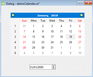 In order to enable the user to select a date, you need to display a monthly calendar. Calendar Widget in Qt Designer helps in doing so. This widget is an instance of the QCalendarWidget class that displays the current month and year by default and can be changed if desired. The days appear in short form (Sun, Mon, Tue, and so on), and Saturday and Sunday are marked in red. Also, Sunday is displayed as the first column in the calendar. You can use the following properties of Calendar Widget to configure its display: