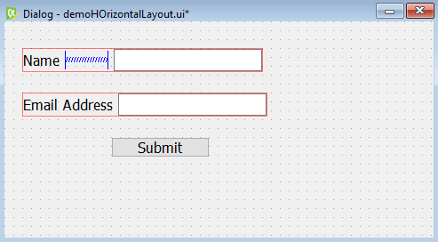 - To horizontally align the second pair of Label widgets with the text, Email Address, and the Line Edit widget beside it, repeat the same procedure as mentioned in steps 6 and 7. This pair of Label and Line Edit widgets will also be horizontally aligned, as shown in the following screenshot.