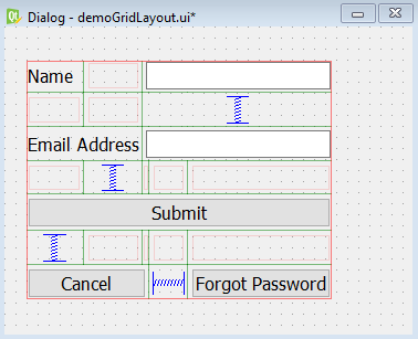 The form will now appear as shown in the following screenshot: - Save the application by name as demoGridLayout.ui.