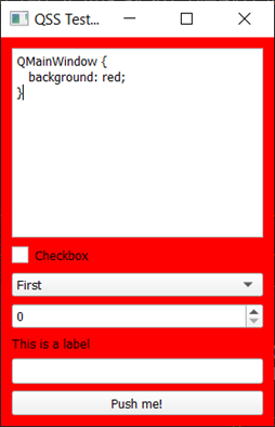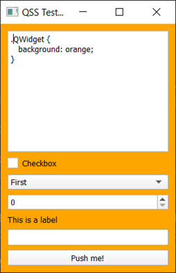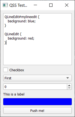 Next we’ll go through the properties available to style widgets with QSS. These have been broken down into logical sections, containing properties that are related to one another to make it easier to digest. You can use the QSS rule tester app we just created to test these styles out on the various widgets.