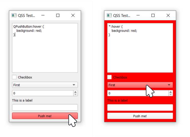 QSS는 개념적으로 웹 스타일을 지정하는 데 사용되는 CSS(CSS 스타일시트)와 매우 유사하며 유사한 구문과 접근 방식을 공유합니다. 이 섹션에서는 QSS의 몇 가지 예와 QSS를 사용하여 위젯 모양을 수정하는 방법을 살펴보겠습니다.