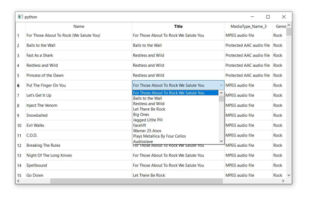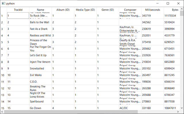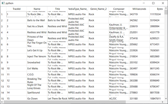 데이터는 테이블 모델에 표시되며 스크롤 막대를 사용하여 탐색할 수 있습니다. 데이터베이스를 로드하고 뷰에 track 테이블을 표시하는 전체 코드는 아래를 참조하십시오.