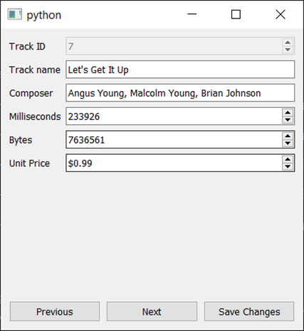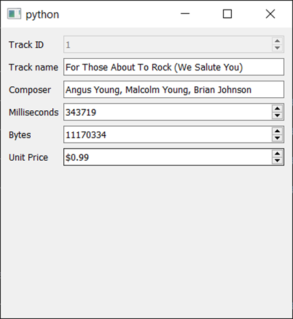 이제 트랙 테이블에서 레코드를 찾아보고 트랙 데이터를 변경한 다음 이러한 변경 내용을 데이터베이스에 전송할 수 있습니다. 이 예제의 전체 소스 코드는 책 소스 코드의 데이터베이스/widget_mapper_controls.py에서 사용할 수 있습니다.