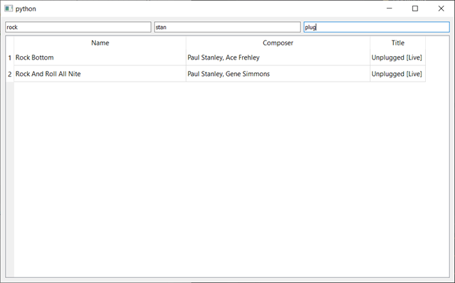주어진 열을 기준으로 테이블을 정렬하려면 모델에서 .setSort()를 호출하여 열 인덱스와 Qt.SortOrder.AscendingOrder 또는 Qt.SortOrder.DescendingOrder를 전달할 수 있습니다.