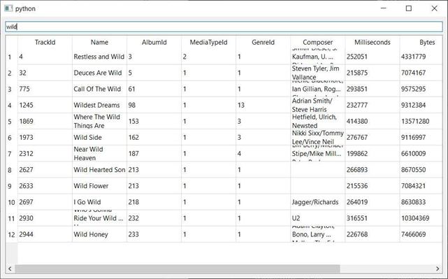 데이터는 테이블 모델에 표시되며 스크롤 막대를 사용하여 탐색할 수 있습니다. 데이터베이스를 로드하고 뷰에 track 테이블을 표시하는 전체 코드는 아래를 참조하십시오.