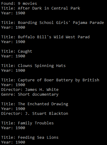 The JSON file, movies.json, is an example (found on GitHub) of a dataset containing information about American movies (title, year, director name, genre, and so on). This is actually a big file but here is an extract, simplified for better readability, to show how its content is organized: