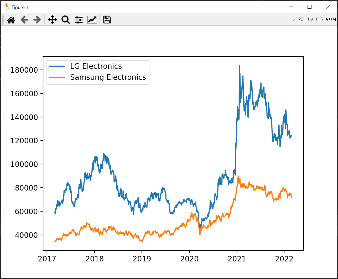 top_axes.plot(sk_hynix.index, sk_hynix['Adj Close'], label='Adjusted Close')