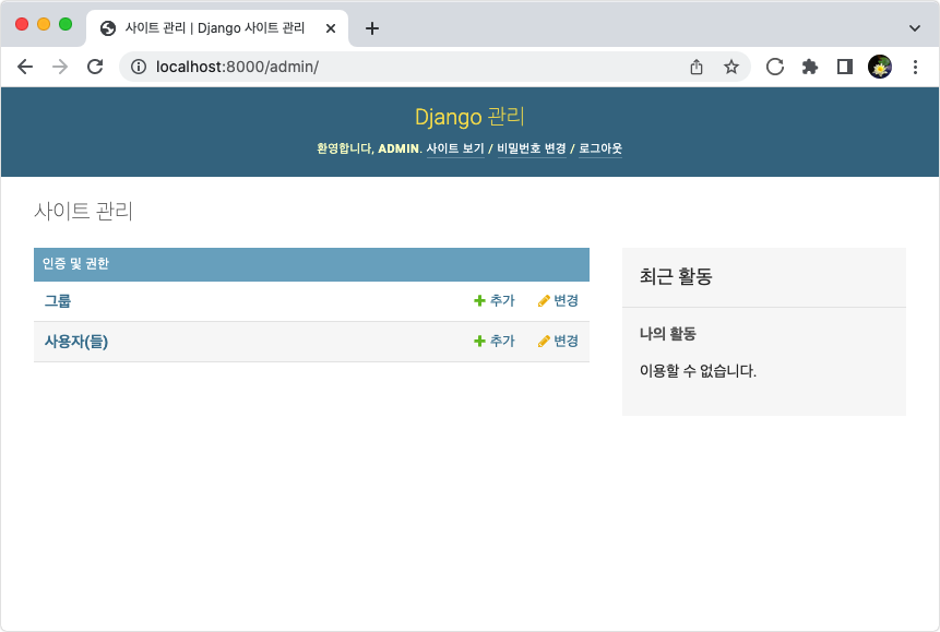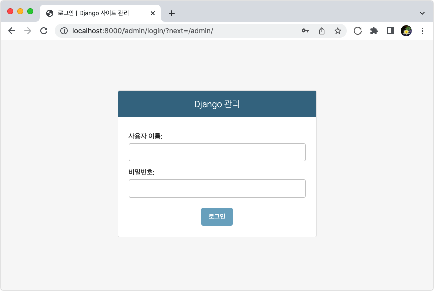 슈퍼유저가 생성되었으니 로컬 서버를 구동한 후 http://localhost:8000/admin/ 페이지에 접속해 보자.