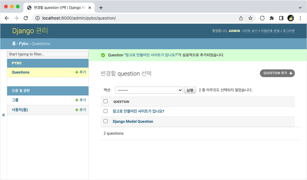 그리고 장고 관리자 화면을 갱신해 보면 다음처럼 Question이 추가된 것을 확인할 수 있다.