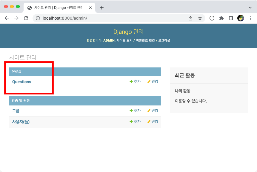 이전에 생성한 Question 모델을 관리자에 등록하면 어떤 일이 벌어지는지 살펴보자.