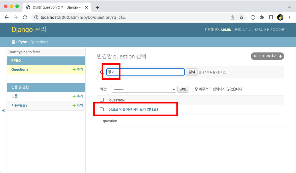 제목에 "장고"라는 문자열이 있는 Question 데이터가 조회된다.