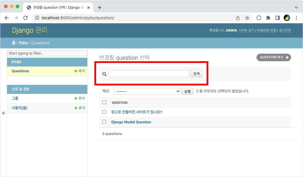 Question 모델에 세부 기능을 추가할 수 있는 QuestionAdmin 클래스를 생성하고 제목 검색을 위해 search_fields 속성에 'subject'를 추가했다. 이렇게 수정하면 다음처럼 검색기능이 추가된 화면을 볼수 있다.