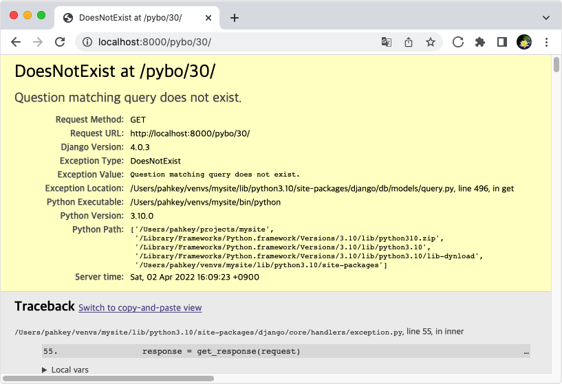 그러면 DoesNotExist 오류가 발생한다. 이 오류는 전달된 question_id가 30이기 때문에 Question.object.get(id=30)이 호출되어 발생한 오류이다. 이 때 브라우저에 전달되는 오류코드는 500이다.