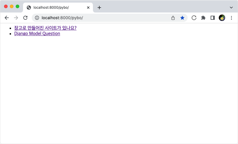 http://localhost:8000/pybo/ 페이지를 요청하면 다음과 같이 변경된 화면을 볼 수 있을 것이다.