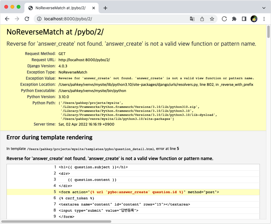 이제 질문 상세 템플릿을 위와 같이 고친 후 질문 상세 페이지를 요청해 보자. 아마도 다음과 같은 answer_create 별칭을 찾을 수 없다는 오류를 만나게 될 것이다. 왜냐하면 질문 상세 템플릿에 {% url 'pybo:answer_create' question.id %}처럼 pybo:answer_create 별칭을 사용했기 때문이다.