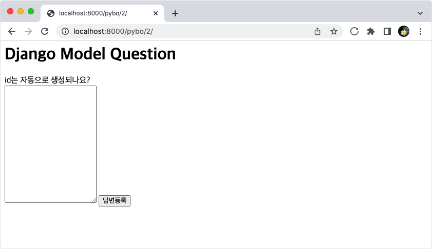 텍스트 창에 아무 값이나 입력하고 답변을 등록해 보자. 하지만 답변을 등록하더라도 화면에는 아무런 변화가 없을 것이다. 왜냐하면 우리는 아직 등록된 답변을 표시하는 기능을 템플릿에 추가하지 않았기 때문이다.