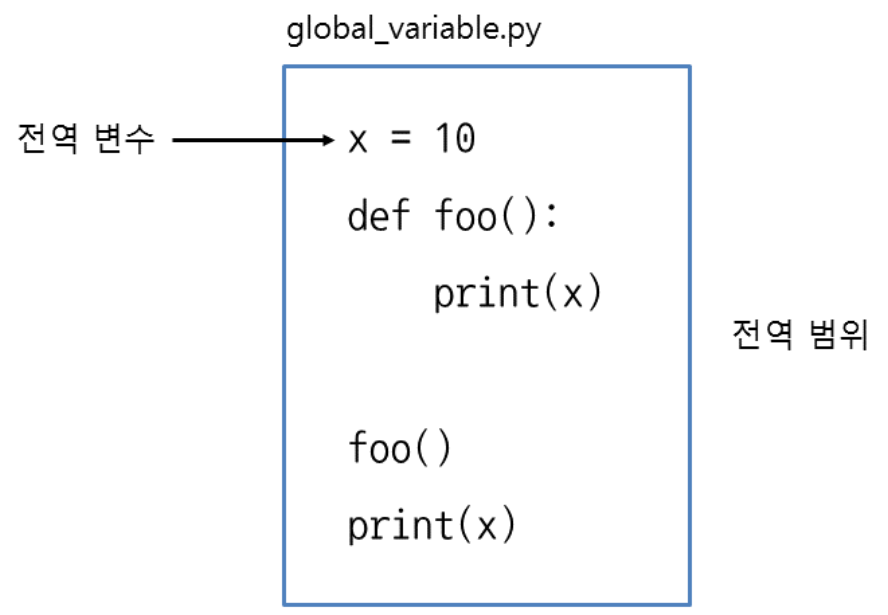 함수를 포함하여 스크립트 전체에서 접근할 수 있는 변수를 전역 변수(global variable)라고 부릅니다. 특히 전역 변수에 접근할 수 있는 범위를 전역 범위(global scope)라고 합니다.