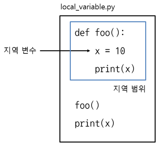 변수 x는 함수 foo 안에서 만들었기 때문에 foo의 지역 변수(local variable)입니다. 따라서 지역 변수는 변수를 만든 함수 안에서만 접근할 수 있고, 함수 바깥에서는 접근할 수 없습니다. 특히 지역 변수를 접근할 수 있는 범위를 지역 범위(local scope)라고 합니다.