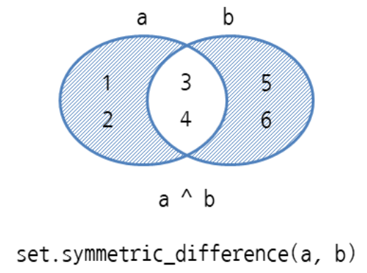 | set.symmetric_difference(세트1, 세트2) | ^ | 두 세트의 대칭차집합 |