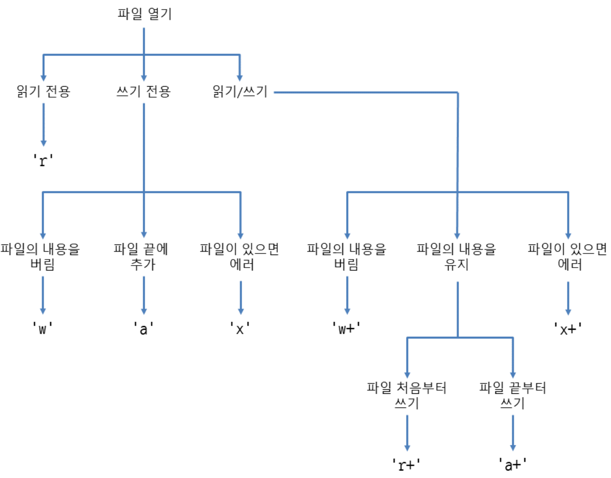 | 'x' | 배타적 생성(쓰기) | 파일을 쓰기 모드로 생성. 파일이 이미 있으면 에러 발생 |