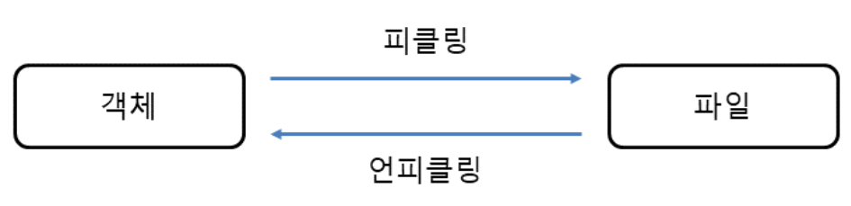 다음과 같이 파이썬 객체를 파일에 저장하는 과정을 피클링(pickling)이라고 하고, 파일에서 객체를 읽어오는 과정을 언피클링(unpickling)이라고 합니다.