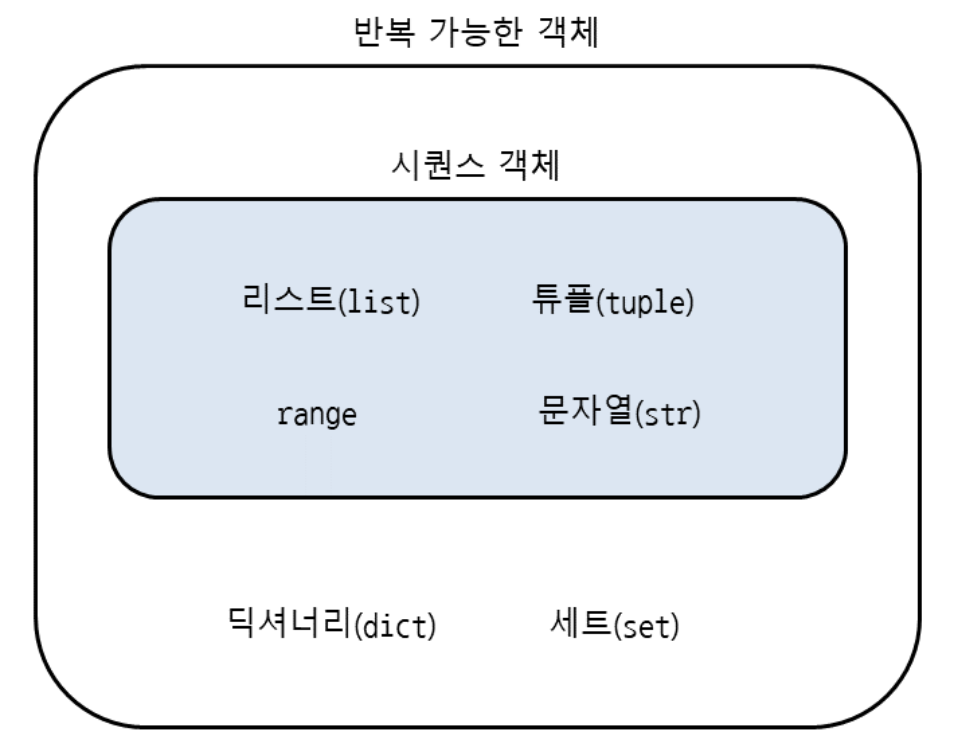 시퀀스 객체는 요소의 순서가 정해져 있고 연속적(sequence)으로 이어져 있어야 하는데, 딕셔너리와 세트는 요소(키)의 순서가 정해져 있지 않기 때문입니다. 따라서 시퀀스 객체가 반복 가능한 객체보다 좁은 개념입니다.