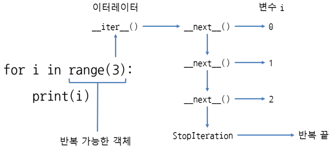 이터레이터는 __next__로 요소를 계속 꺼내다가 꺼낼 요소가 없으면 StopIteration 예외를 발생시켜서 반복을 끝냅니다.