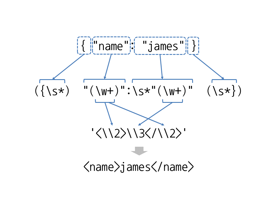외계어처럼 보이지만 부분부분 나눠서 보면 어렵지 않습니다. 이 정규표현식에서 그룹은 4개입니다. 맨 처음 ({\s*)은 {와 공백을 찾으므로 '{ '을 찾습니다. 그리고 마지막 (\s*})은 공백과 }를 찾으므로 ' }'를 찾습니다. 중간에 있는 "(\w+)":\s*"(\w+)"은 :을 기준으로 양 옆의 name과 james를 찾습니다. 바꿀 문자열은 '<\\2>'과 같이 그룹 2 name과 그룹 3 james만 사용하고 그룹 1 '{ ', 그룹 4 '} '는 버립니다.