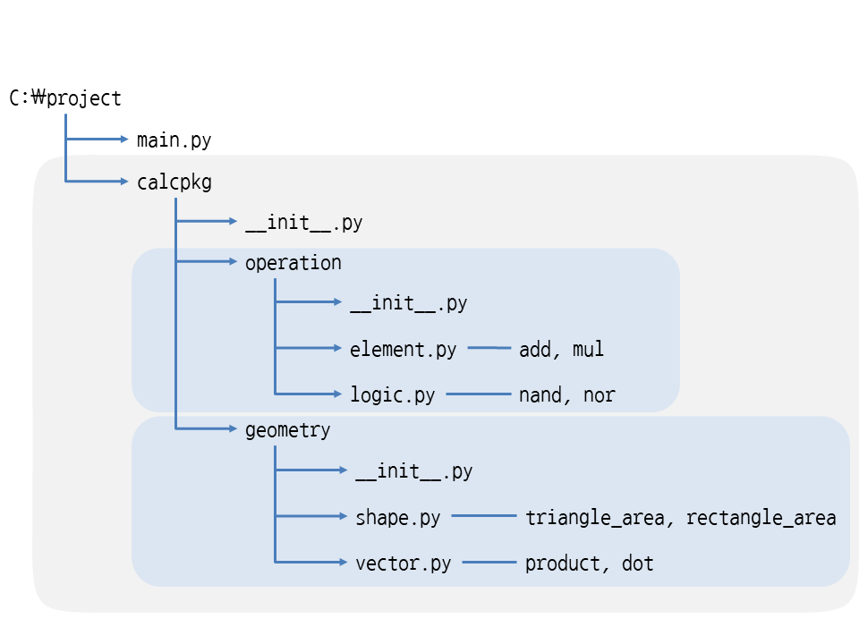 예를 들어서 다음과 같이 calcpkg 안에 operation과 geometry 하위 패키지가 있고, 그 아래에 모듈이 들어있습니다.