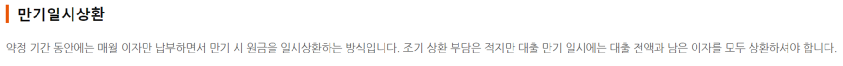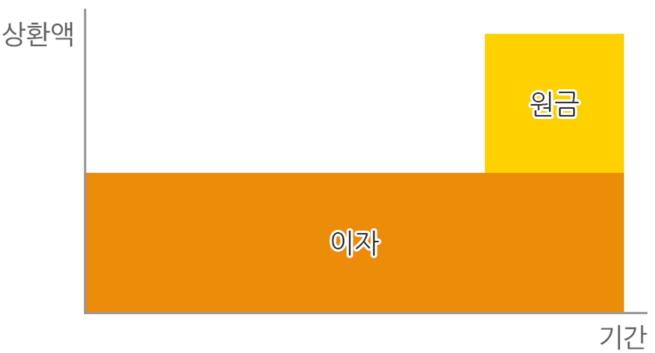 대출원금을 대출 만기일에 전부 상환하며, 대출기간 중에는 이자만 납부한다. 원리금 상환금액 부담은 가장 적으나, 대출원금이 줄어들지 않으므로 총 납부해야 하는 이자비용이 큰 편이다.