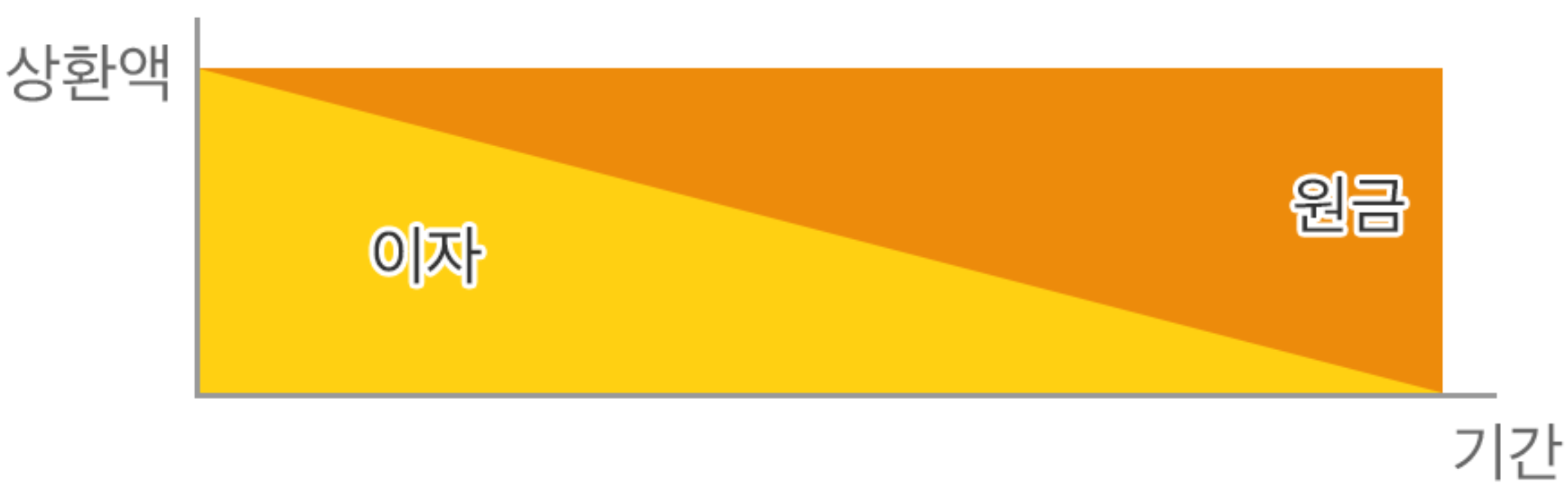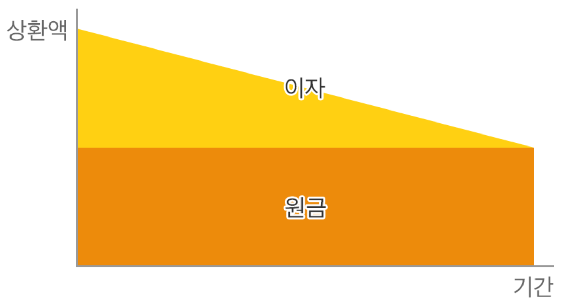 대출한 돈을 일정 기간마다 대출 원금에 대해서는 매월 동일한 금액으로 상환하고 남은 대출 원금에 대한 이자를 상환하는 방식으로 즉 매달 갚아나가는 원금이 일정하고 이자가 변하는 상환 방식이다.