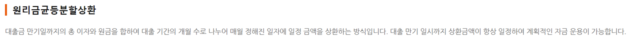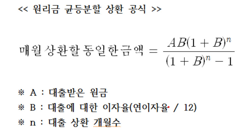 대출 원금과 이자를 합친 금액 즉 원리금을 만기일까지 균등하게 상환하는 대출 상환 방식이다.