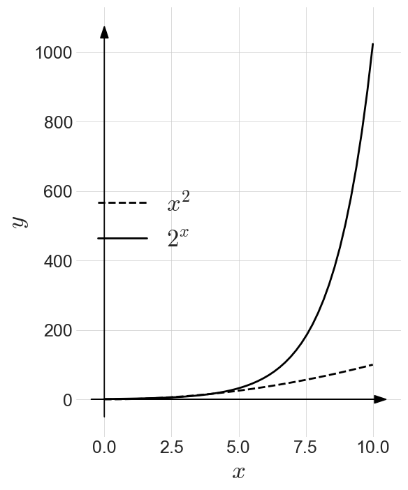 ax1.plot(x, y1, color='k', label=r"$2^x$")