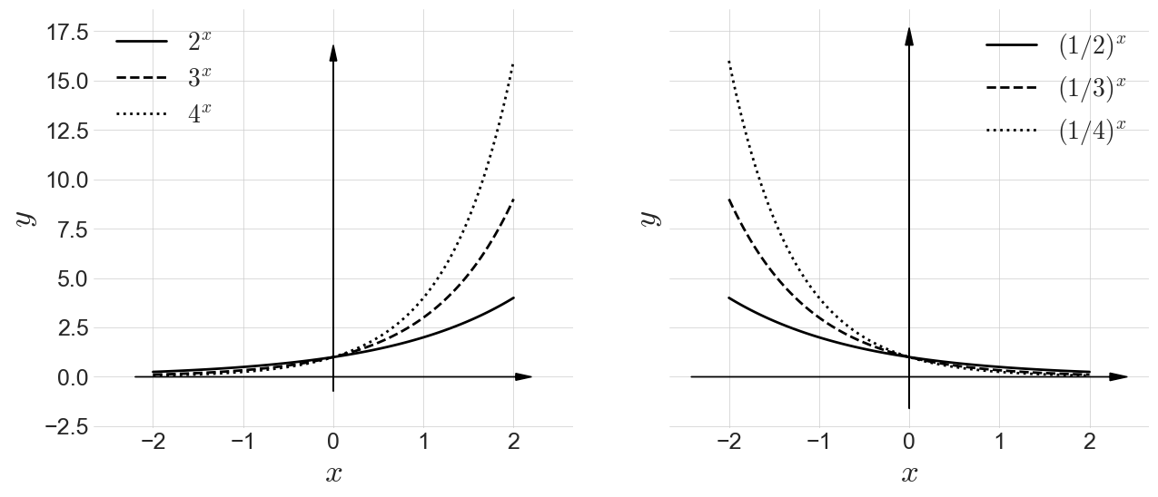 ax2.plot(x, y3, ':', color='k', label=r"$(1/4)^x$")