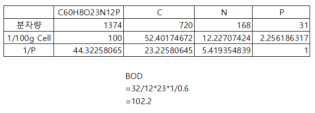 환경공학 Cell Composition by 자동매매 2024. 1. 15. Cell Composition C5H7O2N C60H87O23N12P 수분 : 고형물 = 80:20 유기물/고형물 : 무기물/고형물 = 90:10 Cell : N : P = 100 : 12.2 : 2.3 공유하기 게시글 관리 자동매매 저작자표시 (새창열림) '환경공학' 카테고리의 다른 글 하수특성 (0) 2024.01.17 세균성장과 에너지론 (0) 2024.01.16 산소전달 (0) 2024.01.15 가압부상조 (1) 2024.01.15 반응속도 (0) 2024.01.13 관련글 하수특성 세균성장과 에너지론 산소전달 가압부상조 댓글