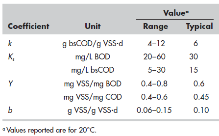 5. Typical kinetic coefficients for the activated sludge process for the removal of BOD from domestic wastewater