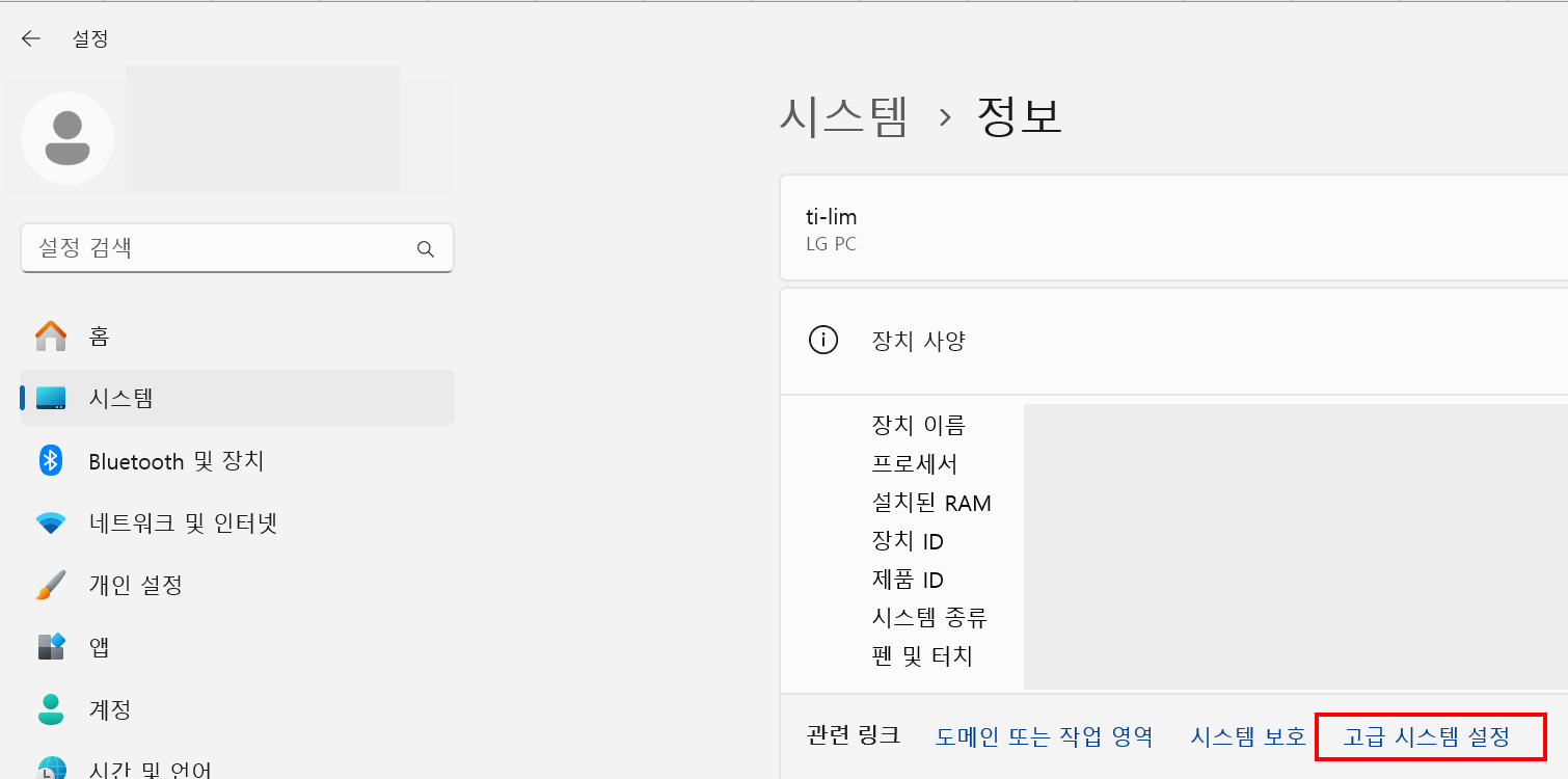 제어판 > 시스템 > 고급 시스템 설정 > 고급 탭 > 환경 변수(N) > 사용자 변수(U)