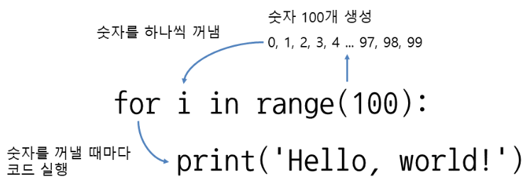 for i in range(100): # 0부터 99까지 증가하면서 100번 반복