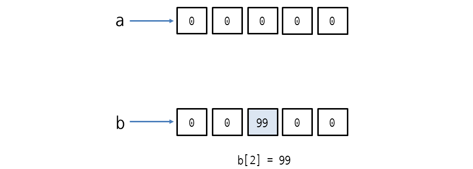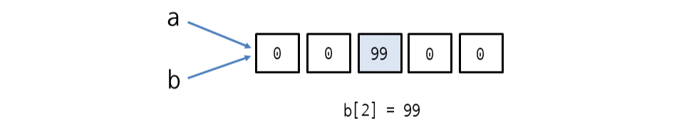 a와 b는 같으므로 b[2] = 99와 같이 리스트 b의 요소를 변경하면 리스트 a와 b에 모두 반영됩니다.