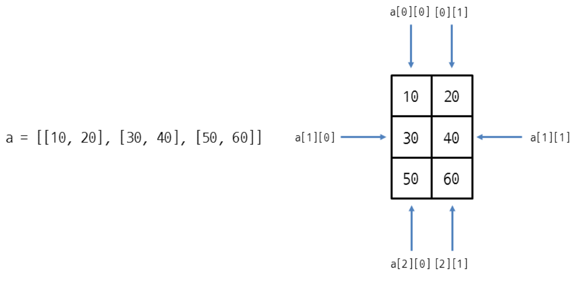 a = ((10, 20), (30, 40), (50, 60)) # 튜플 안에 튜플을 넣은 2차원 튜플