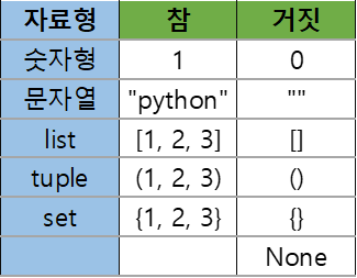 any(iterable) : x의 요소 중 하나라도 참이 있으면 True, x가 모두 거짓일 때에만 False를 반환