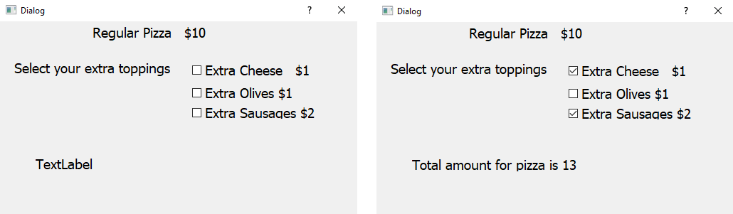 - Import the demoCheckBox1.py file, as a header file in our program to invoke the user interface design and to write code to calculate the total cost of regular pizza, along with the selected toppings, through a Label widget when the user selects or unselects any of the checkboxes.