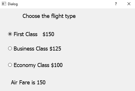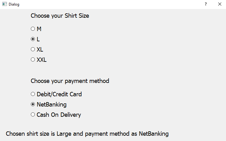 The toggled() event of all the radio buttons is connected to the dispSelected() function, which will display the selected shirt size and payment method. In the dispSelected() function, you check the status of the radio buttons to find out whether they are checked or unchecked. On the basis of the selected radio button in the first vertical layout, the value of the selected1 variable will be set to Medium, Large, Extra Large, or Extra Extra Large. Similarly, from the second vertical layout, depending on the radio button selected, the value of the selected2 variable will be initialized to Debit/Credit Card, NetBanking, or Cash On Delivery. Finally, the shirt size and payment method assigned to the selected1 variable and selected variables will be displayed via the labelSelected widget. On running the application, you get a dialog prompting you to select the shirt size and payment method. On selecting a shirt size and payment method, the selected shirt size and payment method are displayed via the Label widget, as shown in the following screenshot: