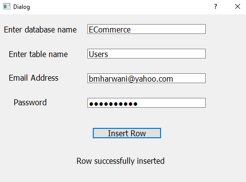 You can see in the script that the click event of the push button with the objectName property pushButtonSearch is connected to the SearchRows() method. This means that, whenever the push button is clicked, the SearchRows() method is invoked. In the SearchRows() method, the connect() method is invoked on the sqlite3 class to establish a connection with the ECommerce database. An SQL search statement is defined that fetches the EmailAddress and Password columns from the Users table whose email address matches the email address supplied. The search SQL statement is executed on the Users table. The fetchone() method is executed on the cursor to fetch one row from the executed SQL statement. If the fetched row is not None, that is, there is a row in the database table that matches the given email address and password, a welcome message is displayed with the Label widget with the objectName property, labelResponse. Finally, the connection to the database is closed.