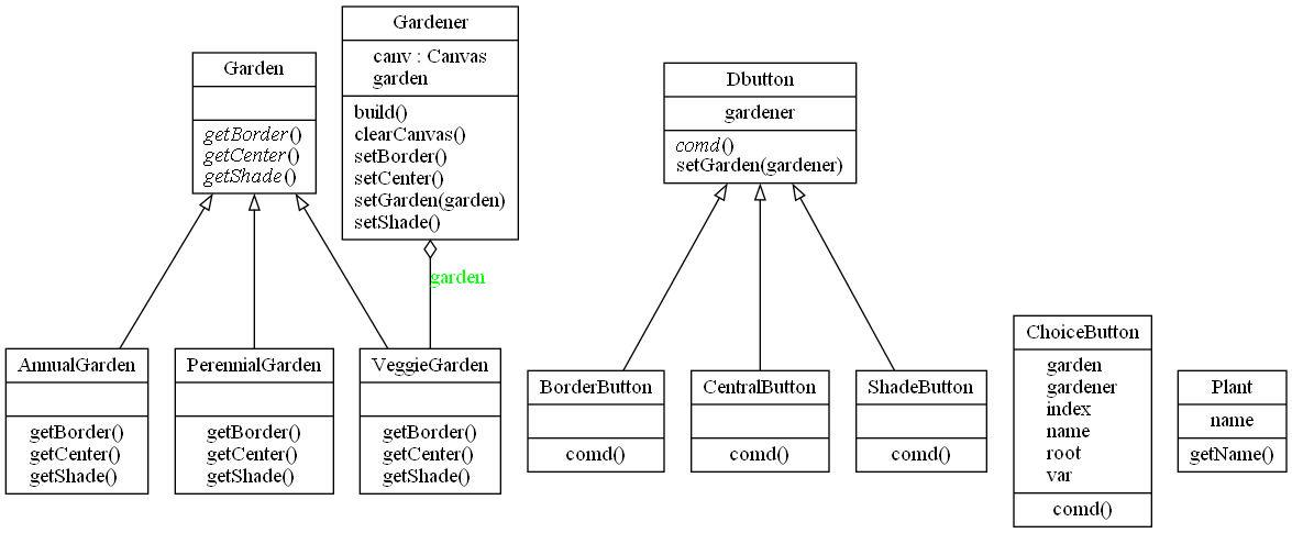 In a similar way, we can create Garden classes for PerennialGarden and AnnualGarden. Now we have a series of Garden objects, each of which returns one of several Plant objects. The factory is really just the three ChoiceButtons, derived from the Radiobutton.