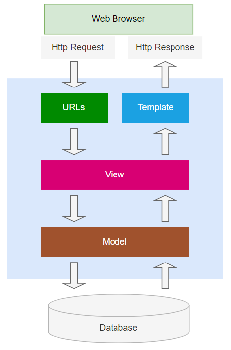 - 웹 브라우저는 URL로 페이지를 요청하고 웹 서버는 HTTP 요청을 Django에 전달합니다.